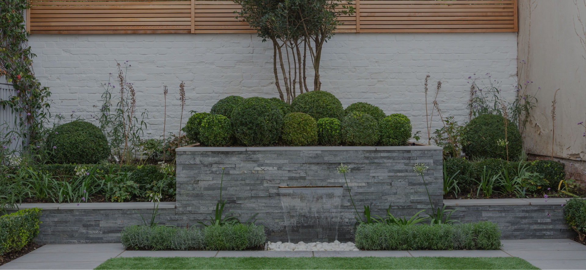 This small quayside garden was surrounded by neighbouring walls from all angles and felt closed in. The client’s brief was to provide some interest to the walls with attractive planting, areas for entertaining and relaxing, and a lawned area for sunbathing and picnics. Cube designed a garden with symmetrical elements to balance and enhance the space available for planting and entertaining. Slatted fence panels and coloured walls were used as alternating features to break up the feeling of enclosure. An Osmanthus Tree created a focal point at the centre of the back fence, underplanted with buxus balls, agapanthus, astrantia, verbenas and anemonies. A bespoke water-feature was formed as part of this feature raised bed, creating an ambient sound to wash away any distractions from the relaxing space. Grey porcelain paving was chosen for a clean contemporary look. Oversized planters softened the neighbouring wall and created a backdrop for the dining and entertaining area. On the opposite side, made-to measure cedar slatted seating was crafted to create a relaxing lounge area. Raised planters added colour to this seating area and softened the neighbouring glass wall. An artificial lawn was chosen for low maintenance and continues the theme of straight contemporary lines. Soft lighting was evenly placed around the garden to enhance the focal points and extend the hours of entertaining.